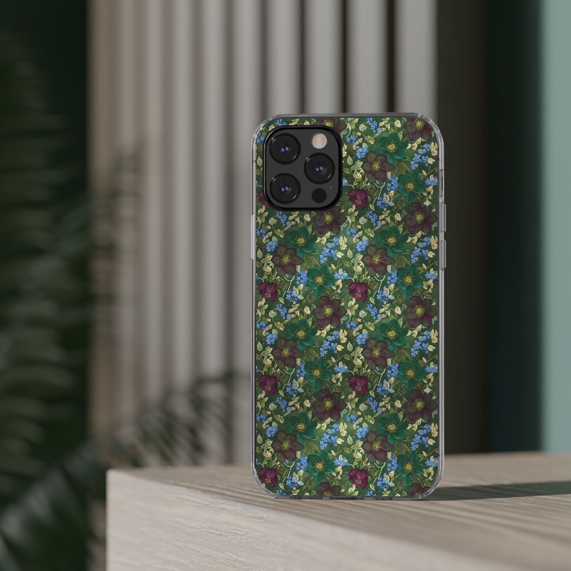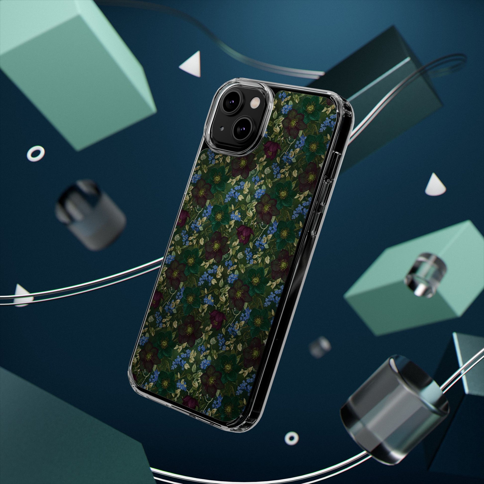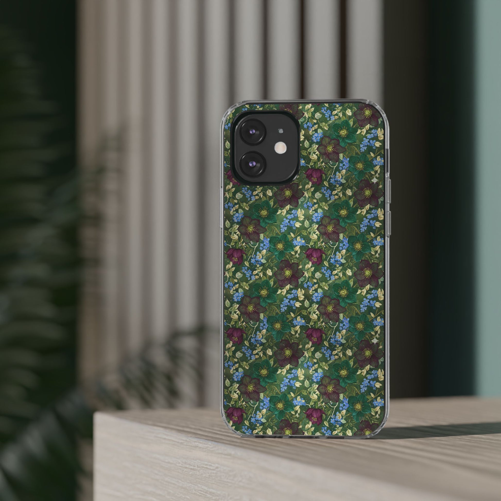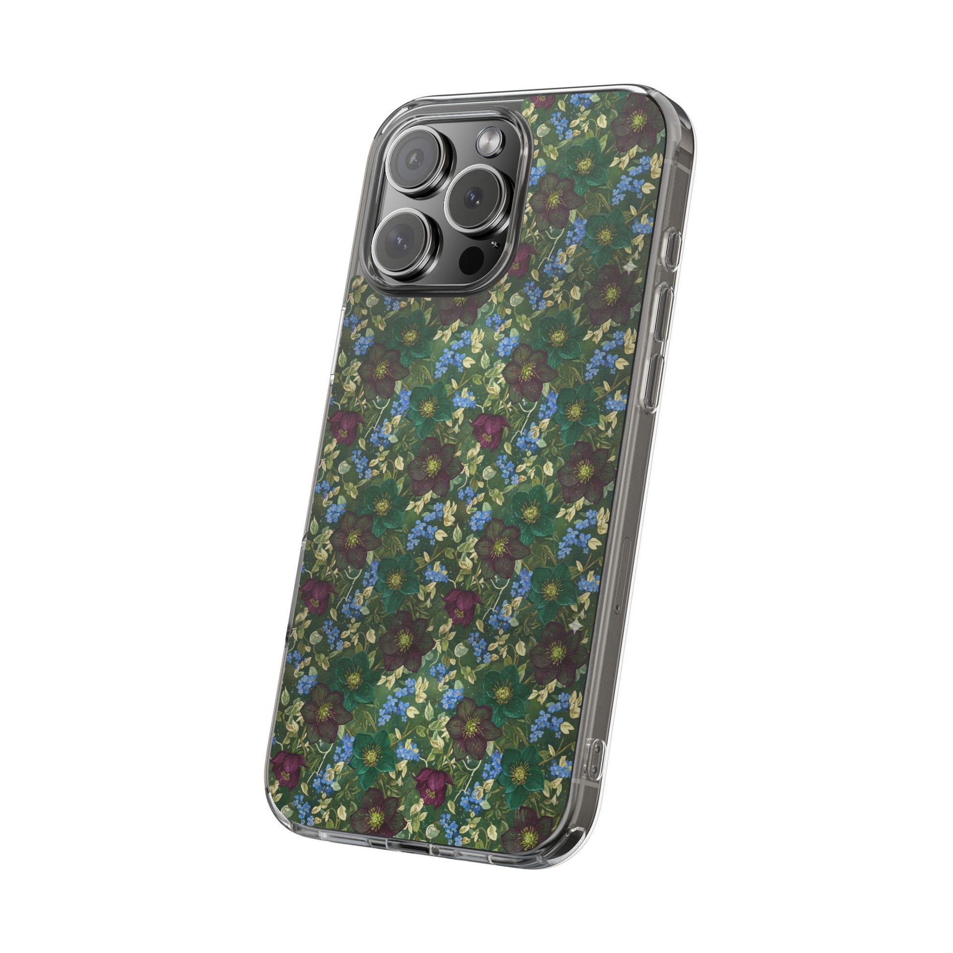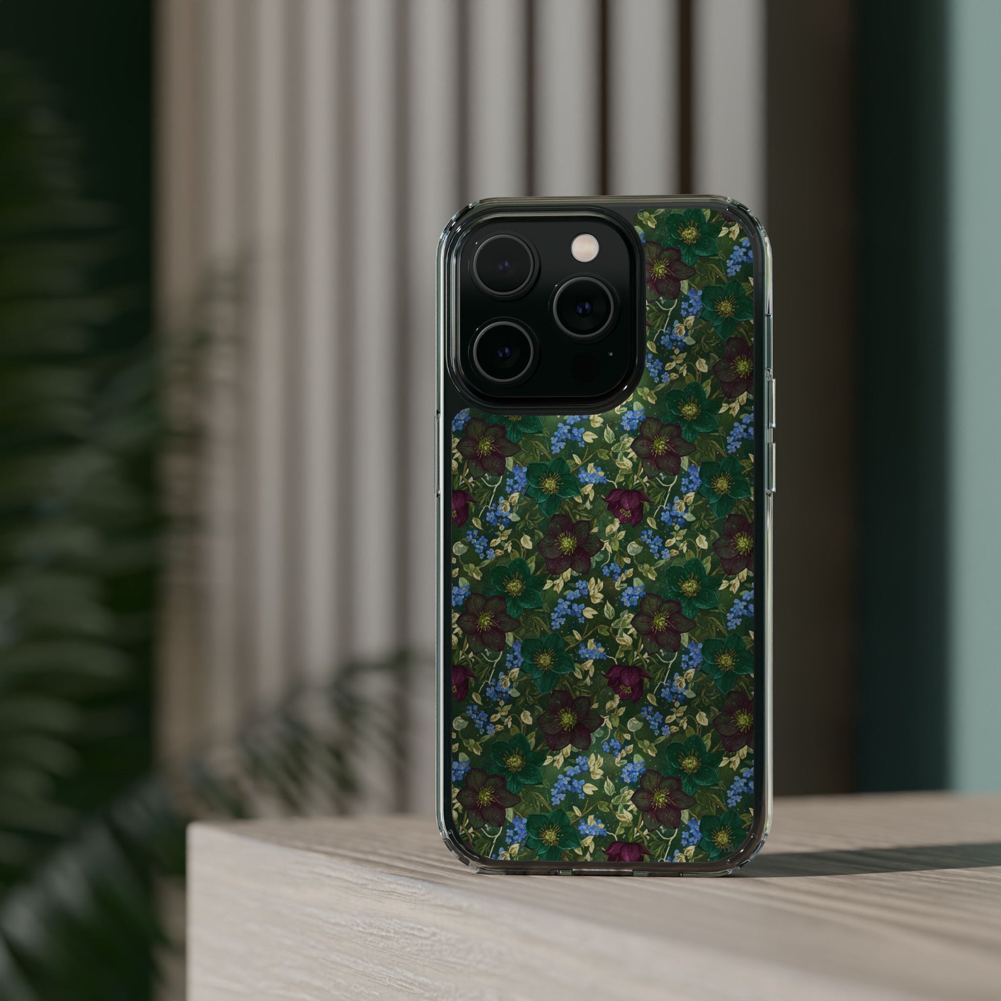 Embrace the beauty of the night with our Midnight Garden case. This stunning design features rich, moody hues of deep purple and forest green hellebores, accented by clusters of bright blue forget-me-nots. Set against a dark, enchanted forest floor, this case from the Bloom Collection is perfect for those who love a touch of mystery and dark botanical elegance.