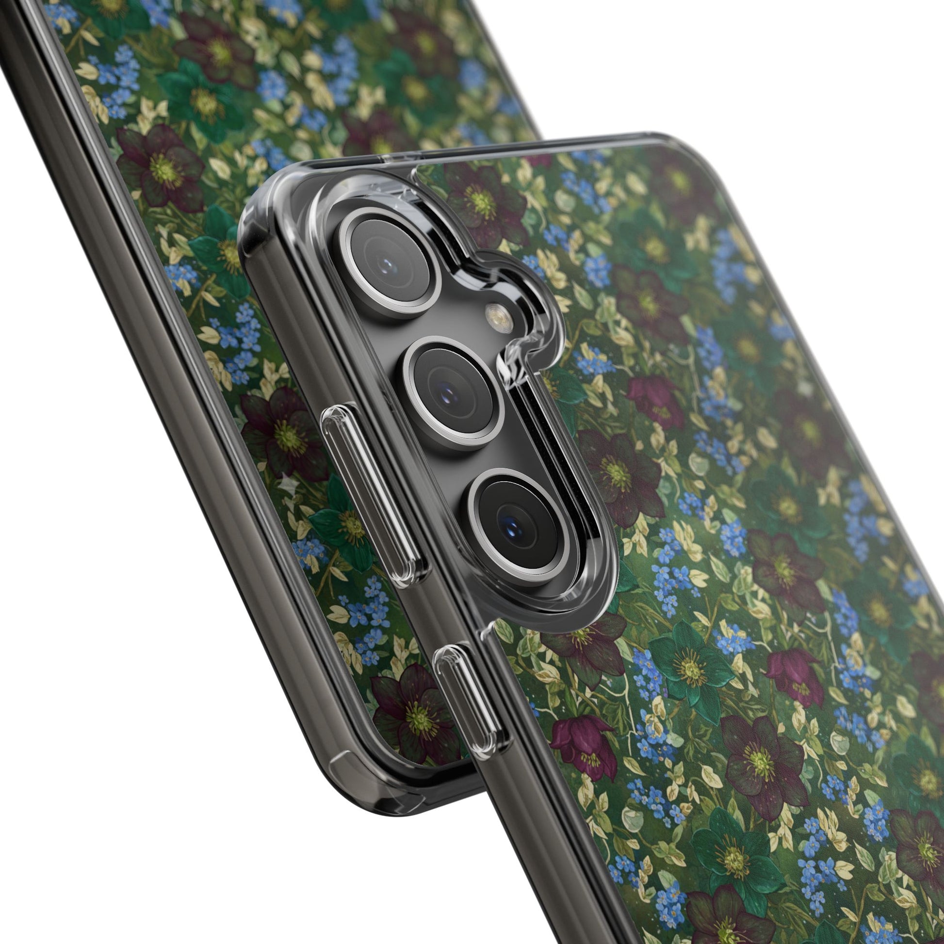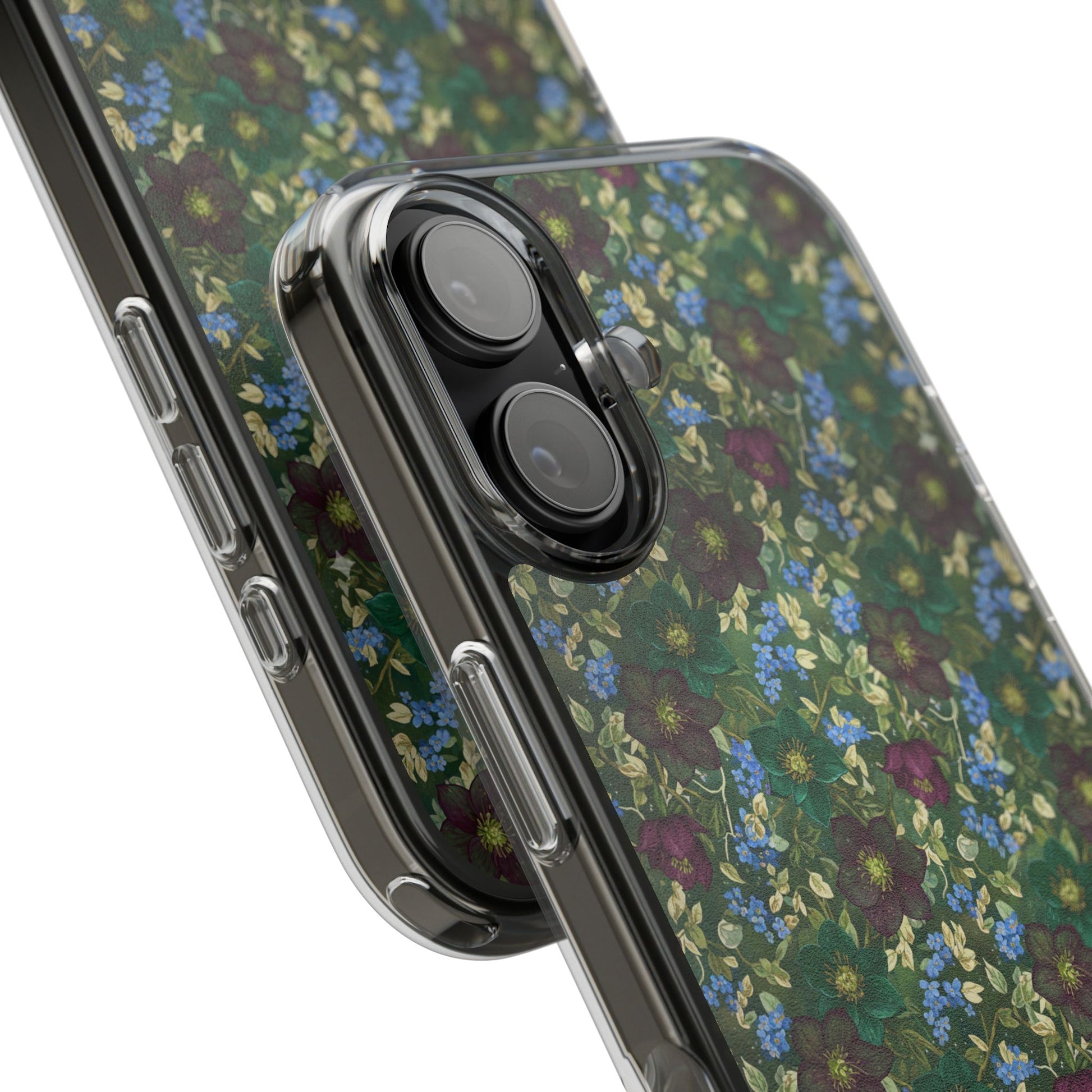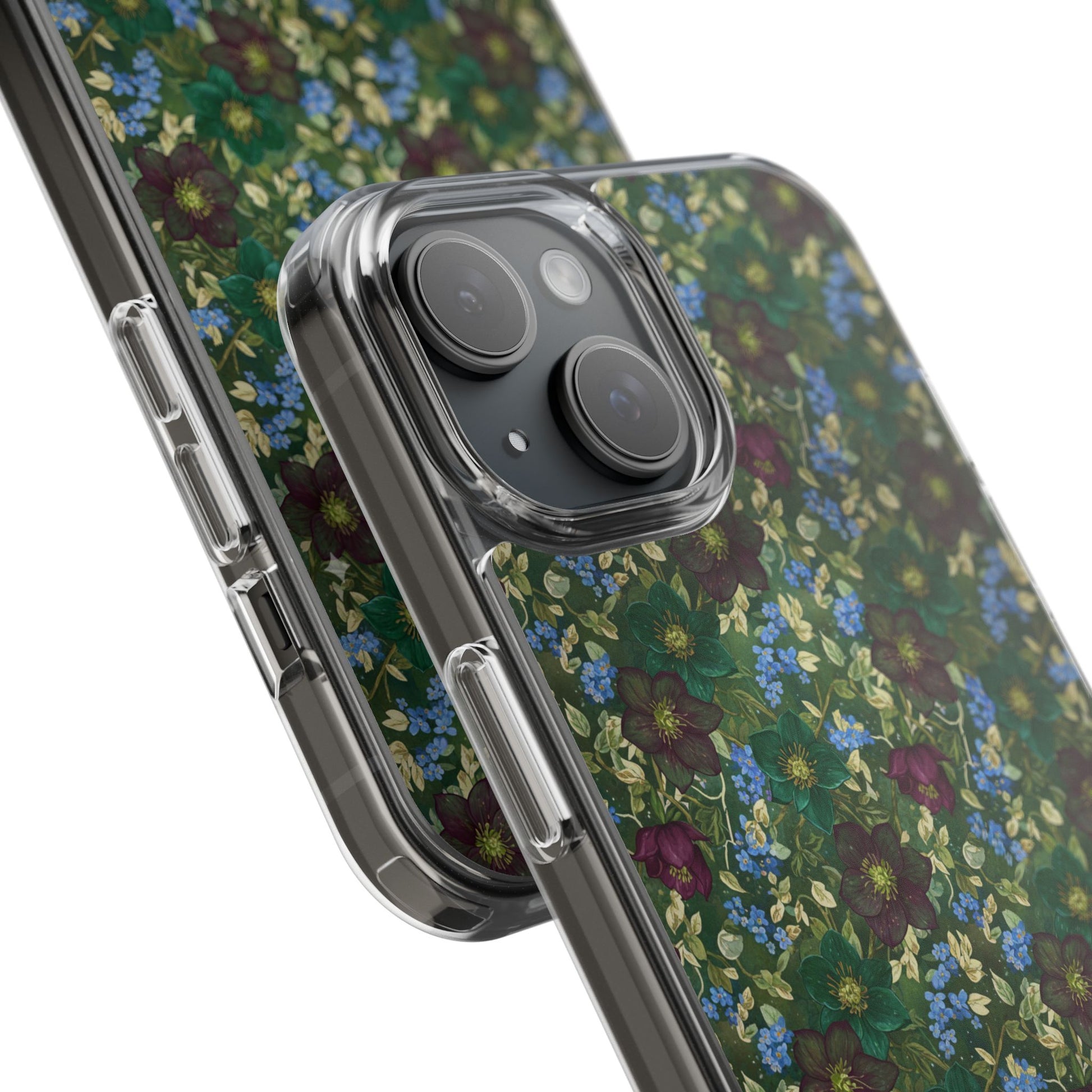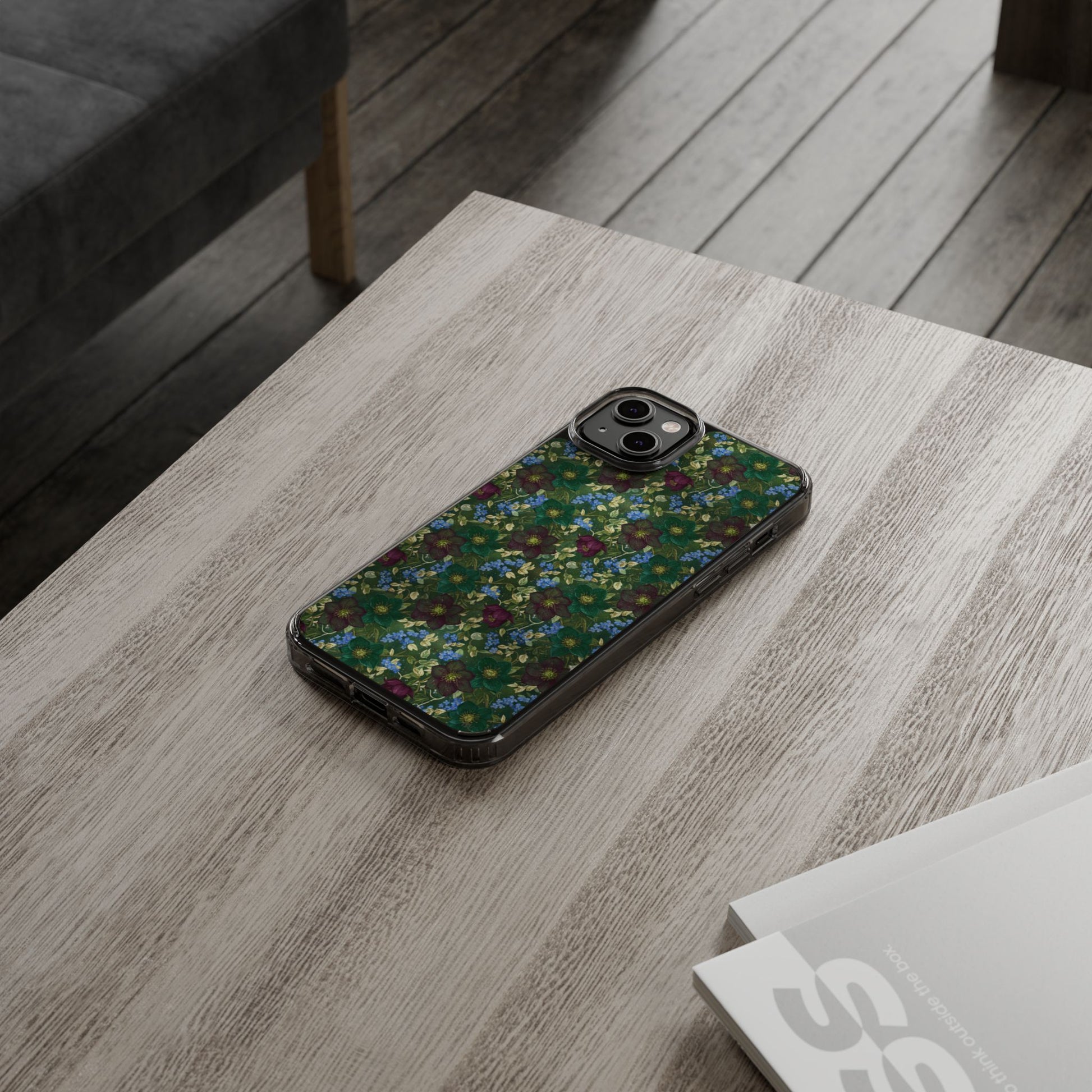 Embrace the beauty of the night with our Midnight Garden case. This stunning design features rich, moody hues of deep purple and forest green hellebores, accented by clusters of bright blue forget-me-nots. Set against a dark, enchanted forest floor, this case from the Bloom Collection is perfect for those who love a touch of mystery and dark botanical elegance.