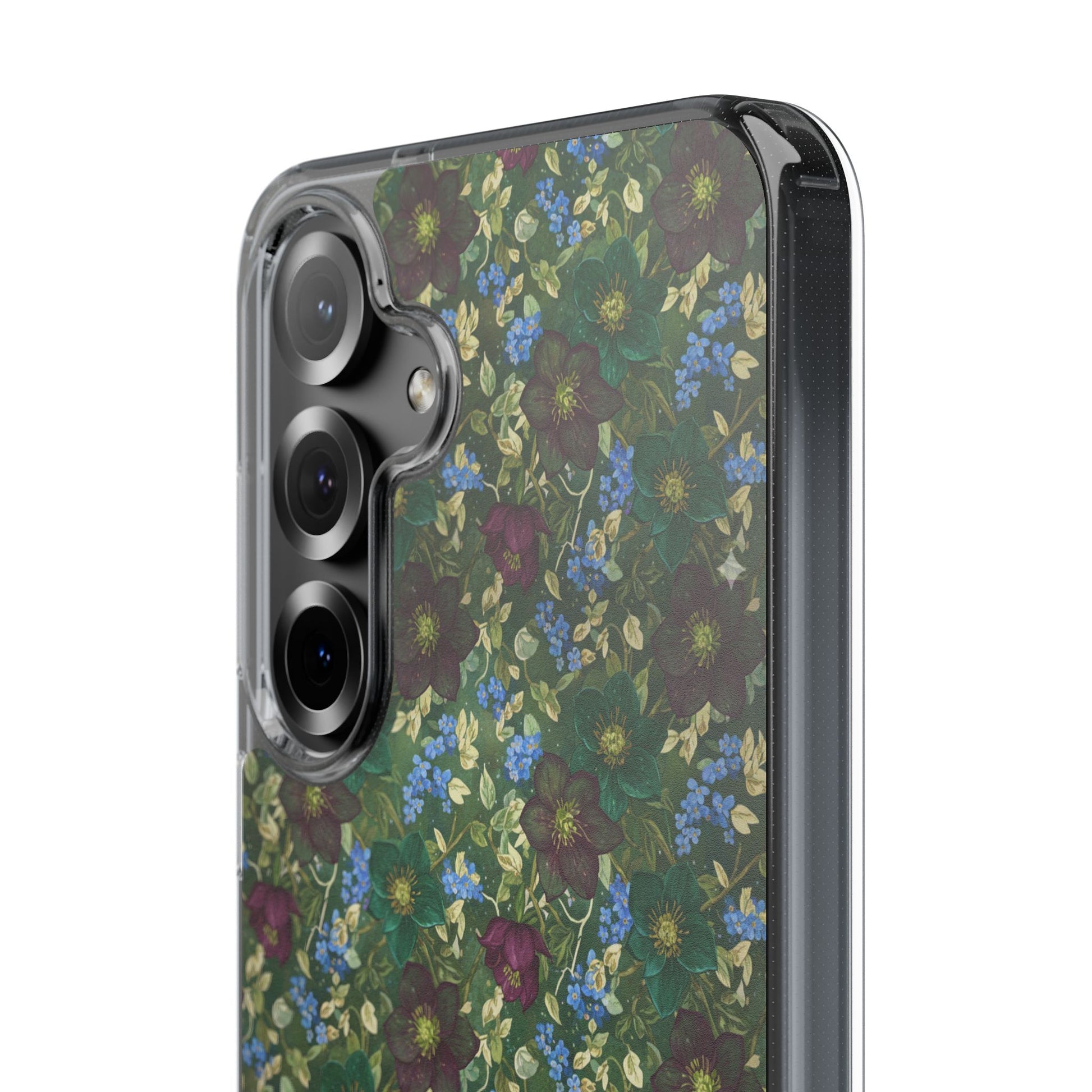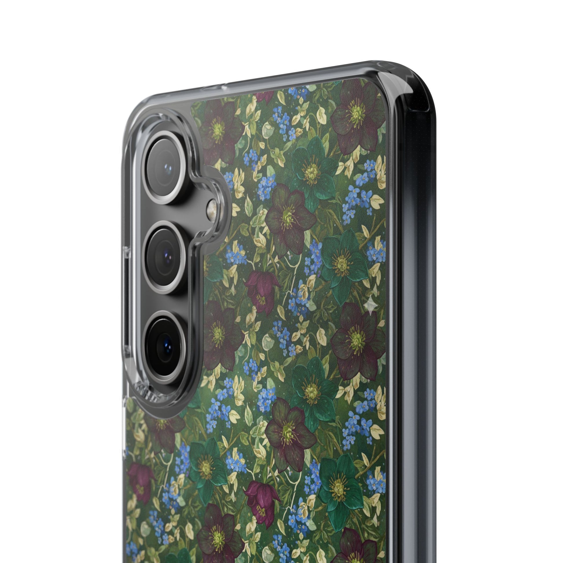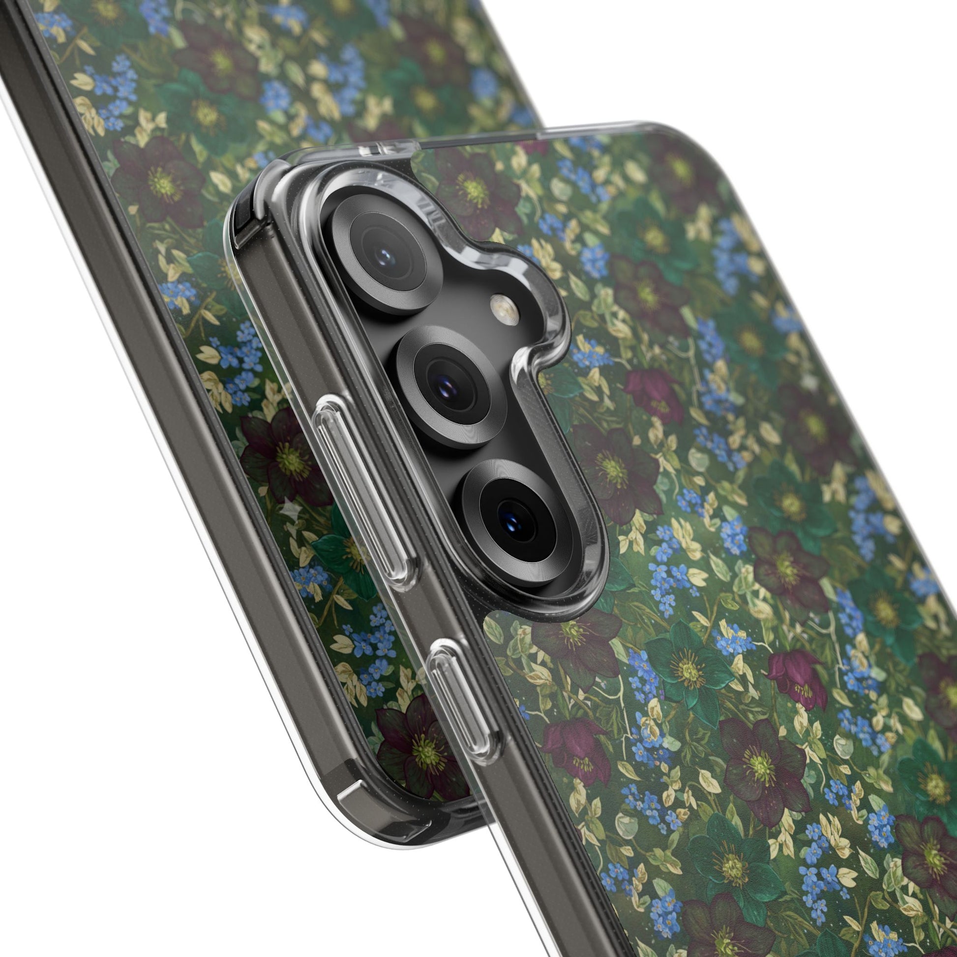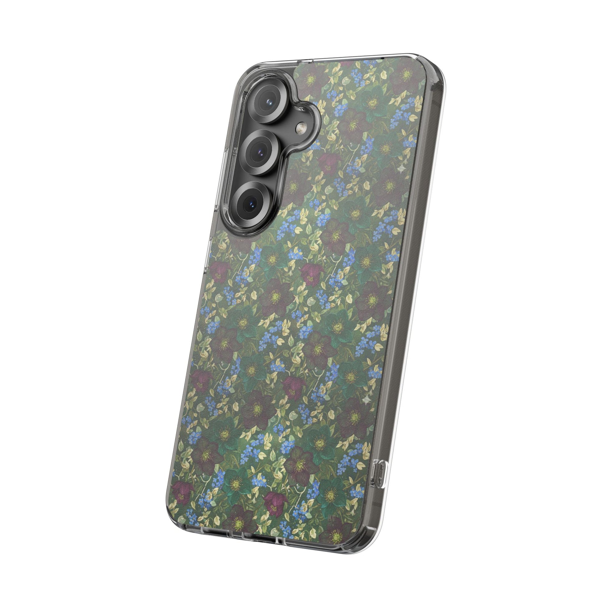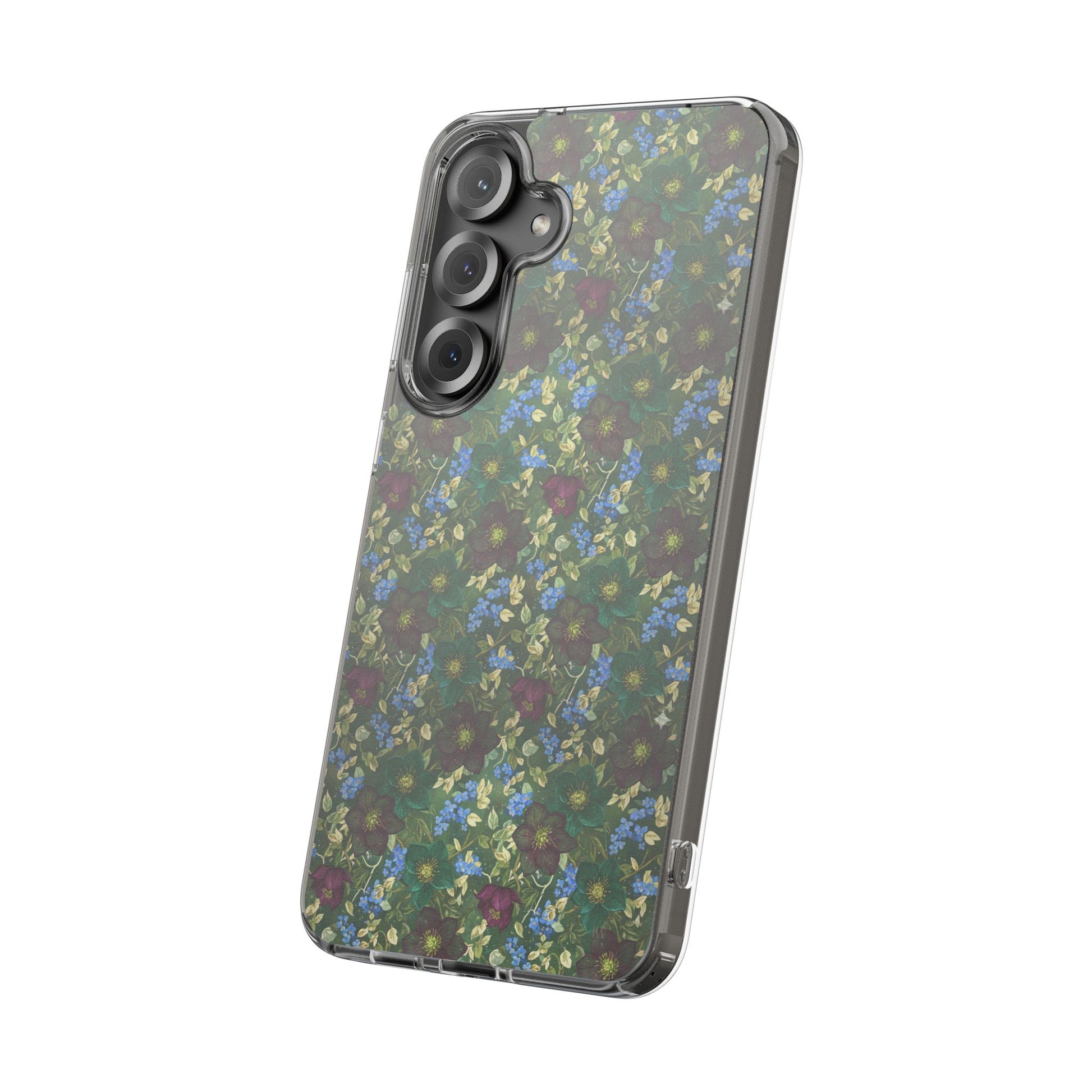Embrace the beauty of the night with our Midnight Garden case. This stunning design features rich, moody hues of deep purple and forest green hellebores, accented by clusters of bright blue forget-me-nots. Set against a dark, enchanted forest floor, this case from the Bloom Collection is perfect for those who love a touch of mystery and dark botanical elegance.
